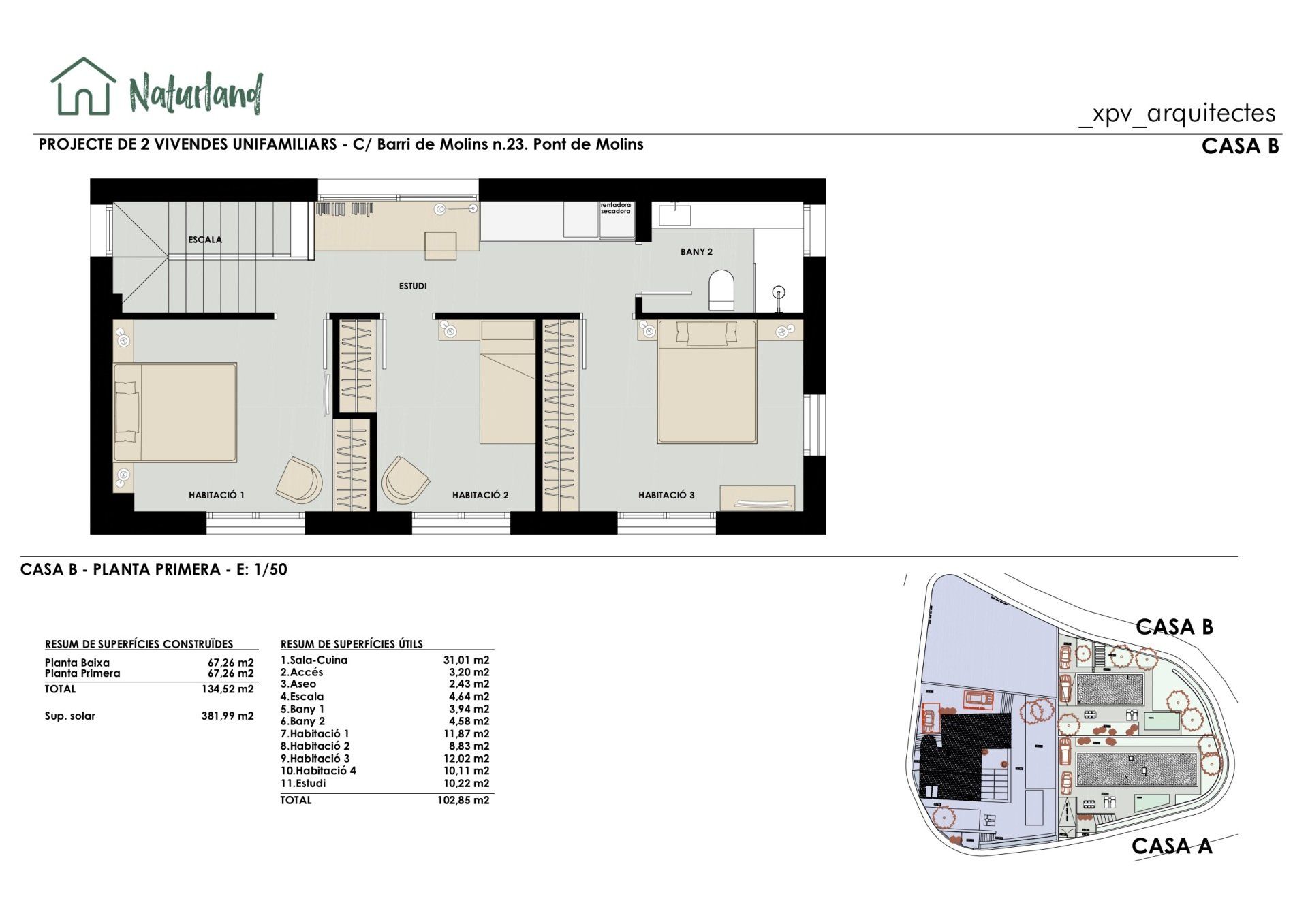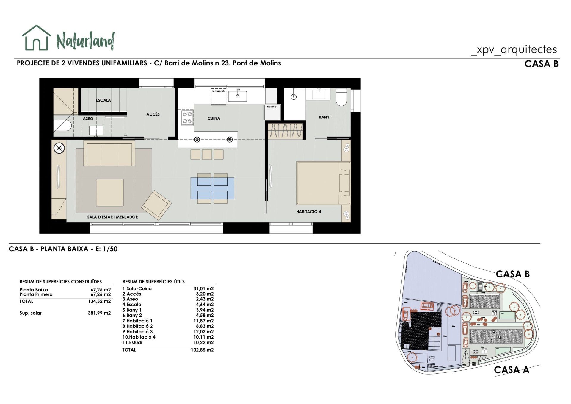 La casa pensada para vivirla. 135m2 repartidos en planta baja y primera planta. Con 4 habitaciones, una de ellas en planta baja, 2 baños y salón-comedor. Diseñada y creada con estilo actual pero con su adn natural y fundiéndose con el paisaje de la zona.